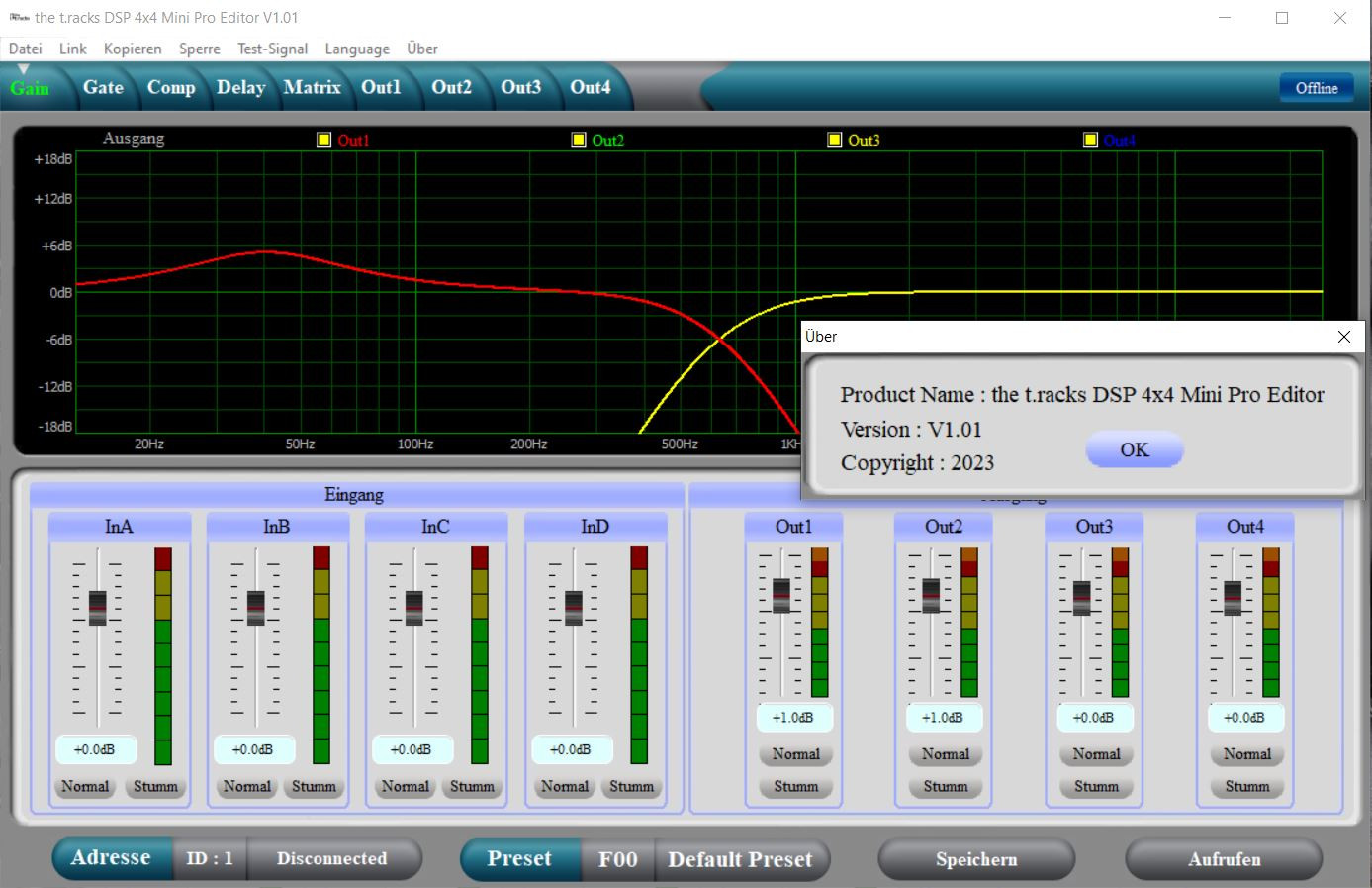 und nach erfolgreicher und schneller Abstimmung am Audaphon DSP 24, weil ich es kenne und sehr gut bedienen kann, habe ich mich an das MiniDSP Flex gemacht, ... die Abstimmung mit der Software hat mich zunächst so aufgeregt dass ich zum Thomann weitergesprungen bin, (also erstmal kein miniDSP). Die Software des Thomannteils ist deutlich besser verständlich. Das Thomann ist das "the t.racks dsp 4x4 mini pro" und die Software dazu sieht so aus: