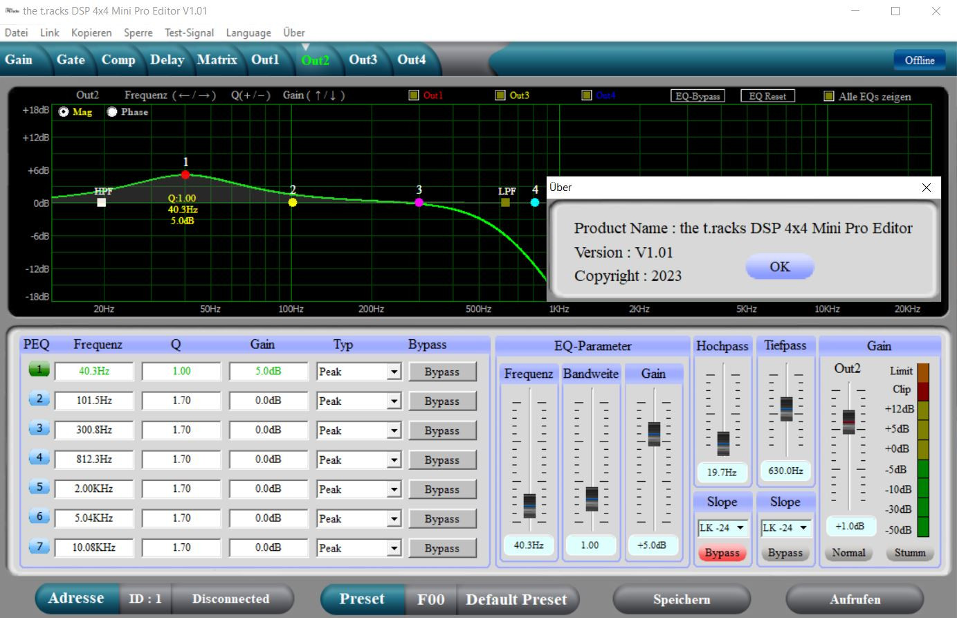 immer wieder zieht es mich in den Hobbykeller um die Thomann track dsp 4x4 mini Pro durchzuprobieren, ... das ist wirklich ein super Teil was von mir eine volle Empfehlung ist. Ich habe gestern das schlechte Wetter genutzt die verschiedenen Ariavarianten über die Weiche zu verfeinern, ... das macht wirklich Laune in der Software die Korrekturen zu machen, ... sprich die Software ist gut zu bedienen, alles Wichtige ist direkt einstellbar, und man benötigt keine lange Einweisung.