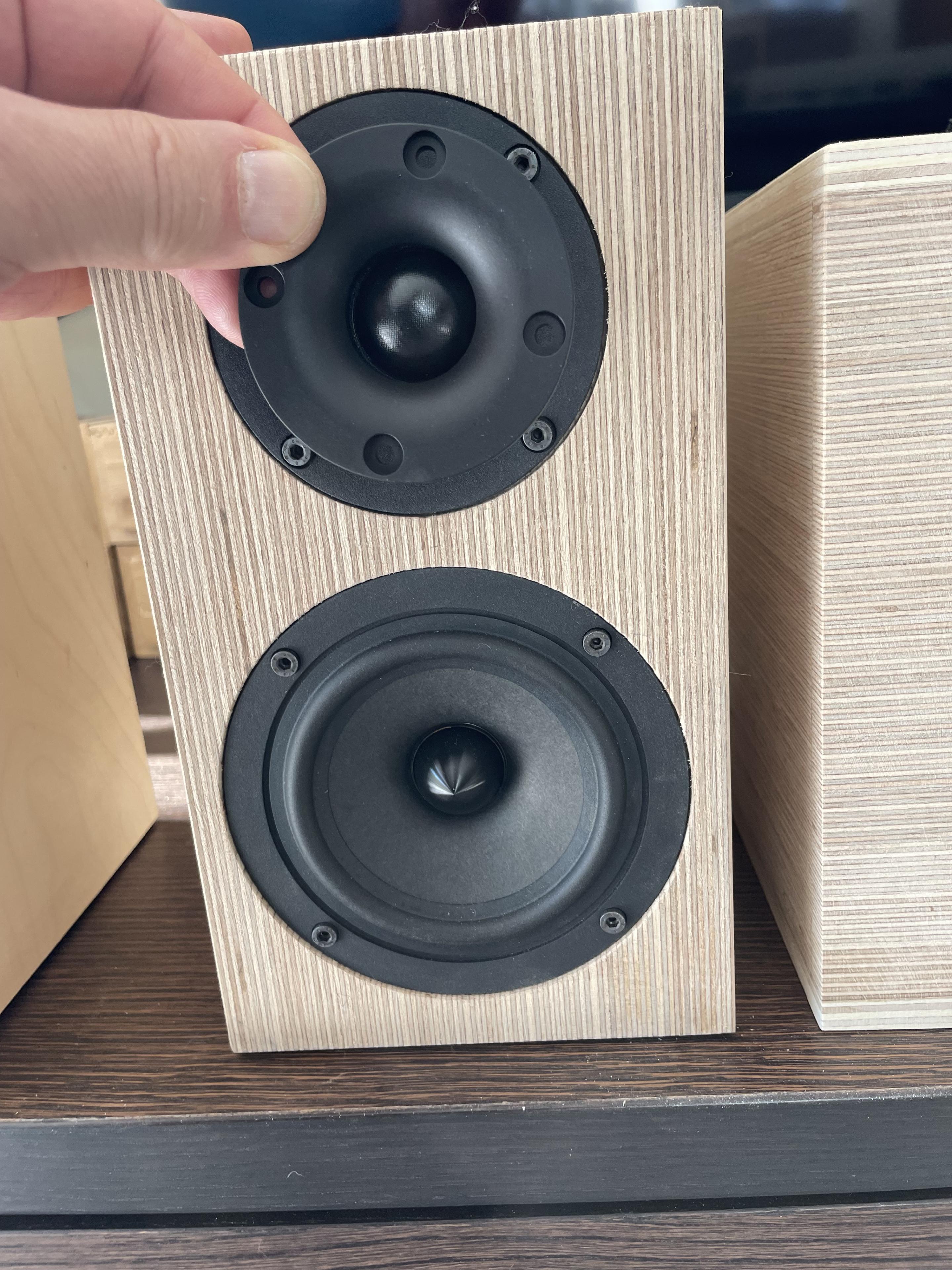 Dieses Mal habe ich Seitenwände und die Schallwand miteinander gefalzt, sodass die Box winkliger wird. Das hat auch sehr gut funktioniert.