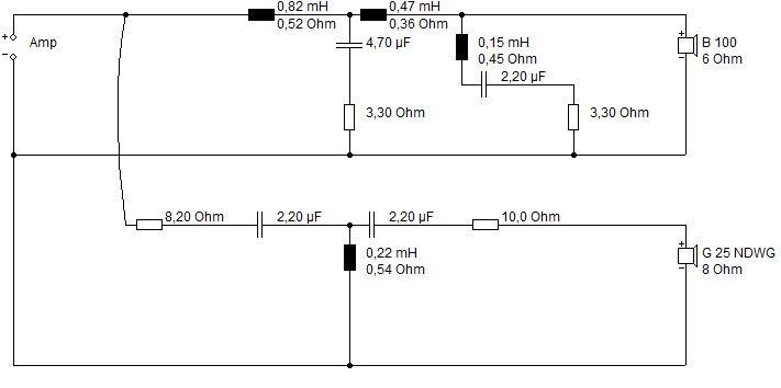 Bei der angehängten Simulation, habe ich auf eine etwas höhere Trennung zwischen TMT und HT geachtet, leider ist die Phase nicht ganz optimal geworden. Mir war wichtig, dass der Energiefrequenzgang passt und dass die Reso des B100 nicht durchkommt, deswegen habe ich mit 18 dB im TMT getrennt. Der Hochton ist dann doch etwas einfacher geworden, aber durch den sehr hohen Kennschalldruck des HT musst man ordenlich mit Widerständen nachhelfen.