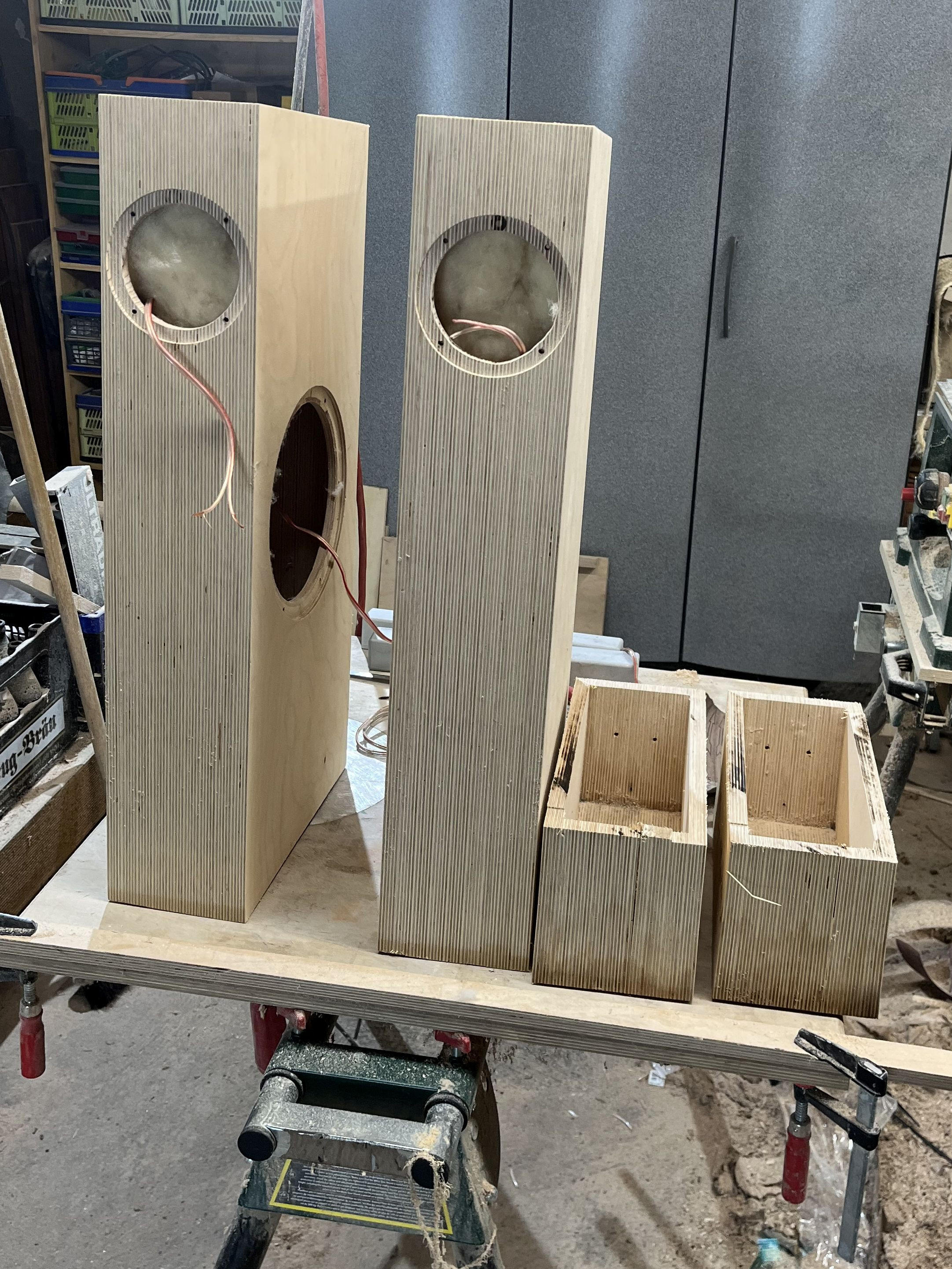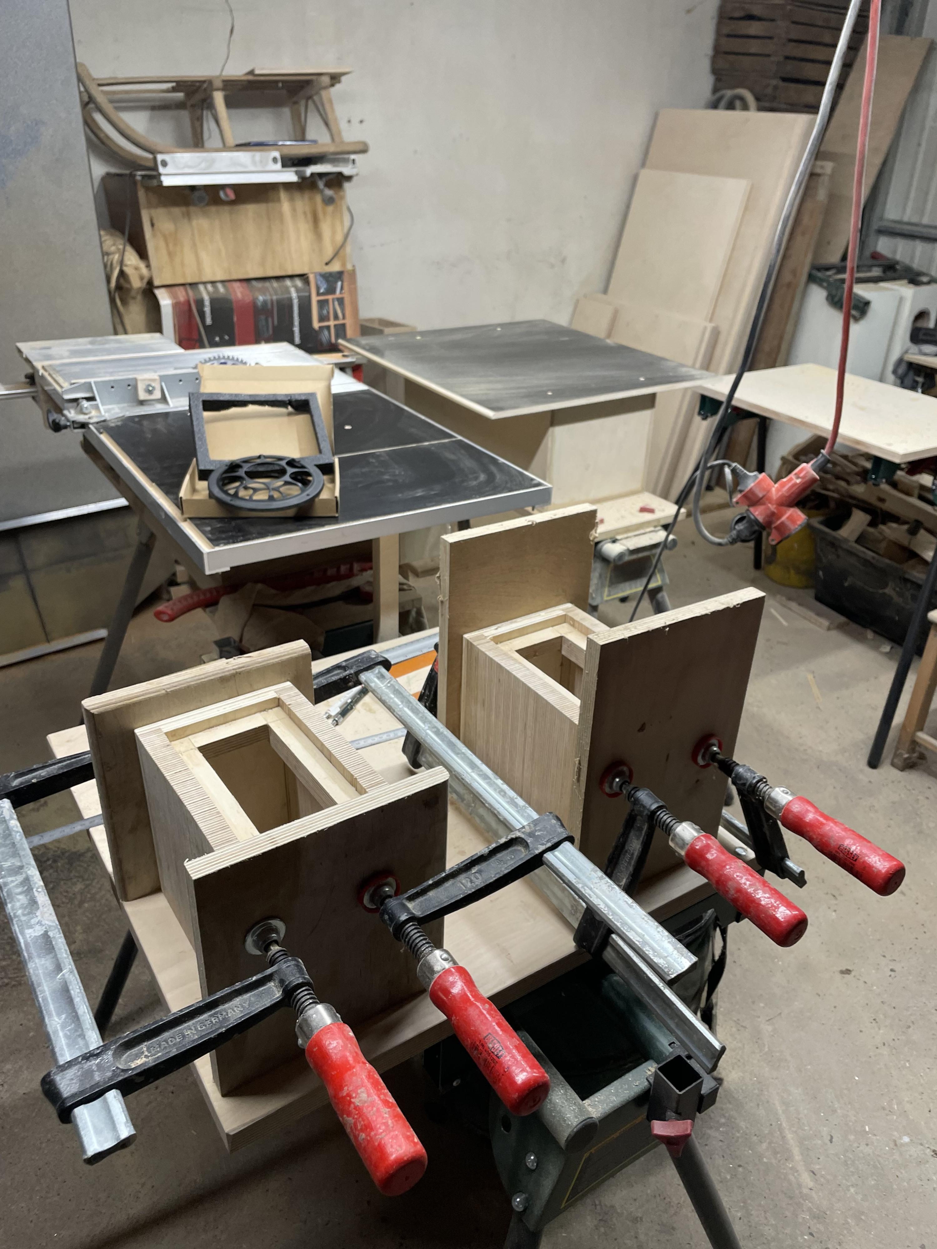 dann erstmal durchtrocknen lassen bis ungefähr 13:30, denn mich hat es wieder in die Garagenwerkstatt gezogen, ... Die beiden Deckel und Böden waren sehr schnell gesägt und dann ging es auch schon um die Feinheiten der Schallwand, der Seiten und der Rückenteils, incl Rahmen, ... Dann noch schnell verleimt und um 15:00 Uhr sieht es dann so aus: (einen Bündigfräser habe ich gerade neu bestellt, deswegen steht noch einiges Über. )