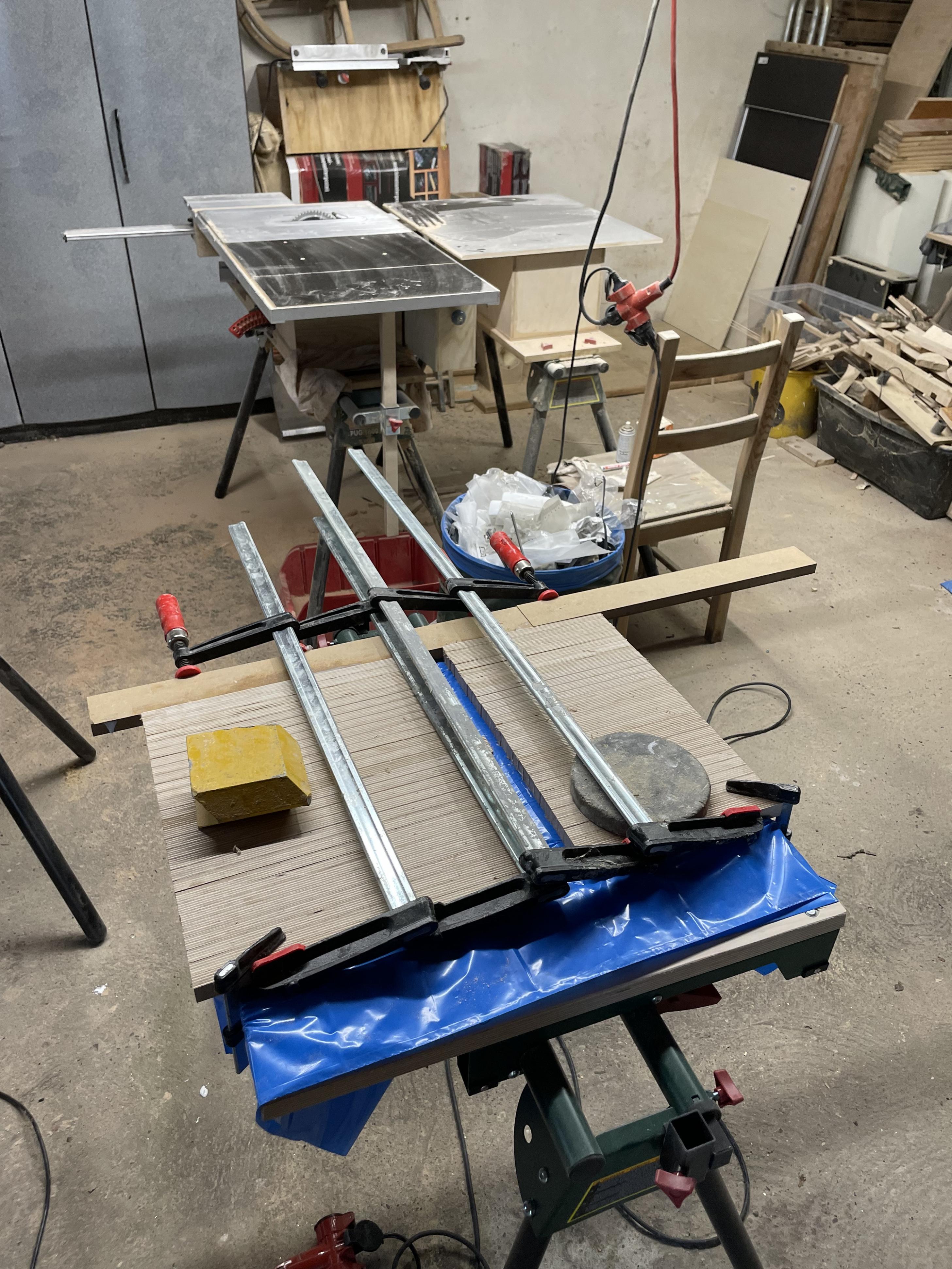und um 11 Uhr waren dann die Streifen in Platten, wie ich sie brauche, verleimt.