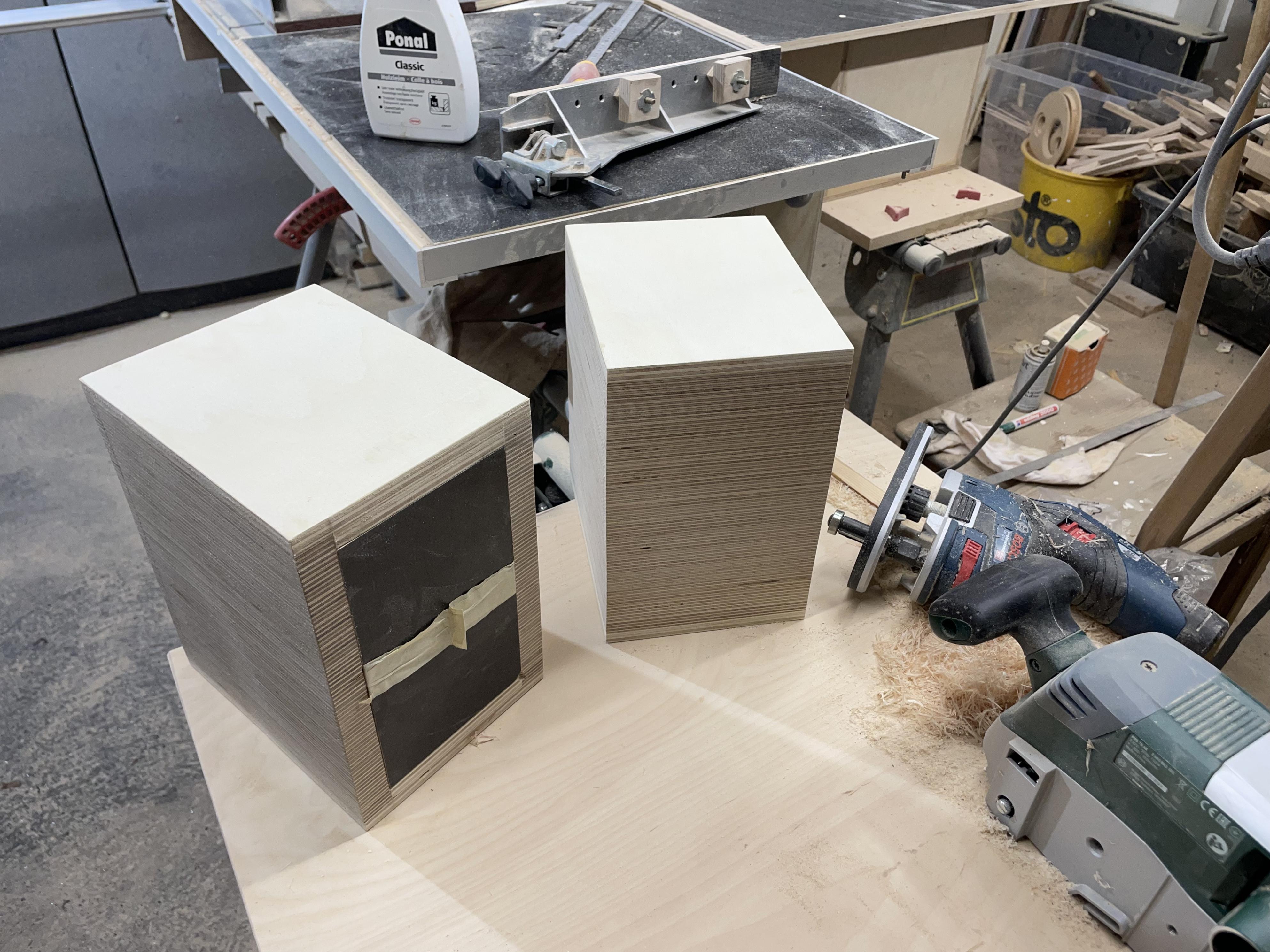 Dieses Mal habe ich Seitenwände und die Schallwand miteinander gefalzt, sodass die Box winkliger wird. Das hat auch sehr gut funktioniert.