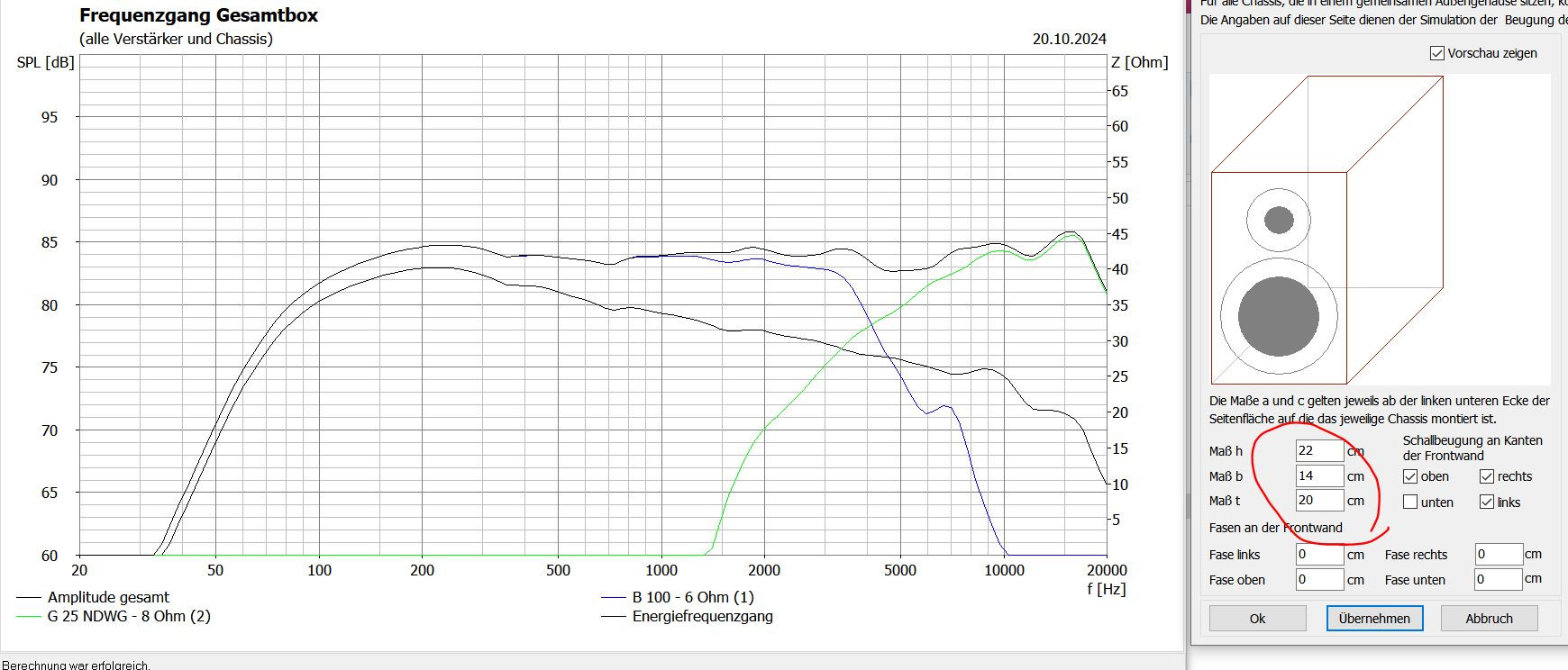 EDIT: die Box wurde mehrmals aufgebaut und die neuste Abstimmung hat eine etwas höhere Trennung und der Hochton ist etwas nach oben gezogen, ... klar sollte sein, dass die aufgebauten Boxen nichts für Fullrange sind, sodass immer ein Subwoofer eingesetzt werden sollte, ... im Zuge der Entwicklung wurde der WIIM Ultra und der WIIM Amp hinzugezogen um ein 2.1 System zu erhalten, ... die größte Ausbaustufe was der Einsatz eines 21 Zoll Beymachassis in 80 Liter CB in Kombination mit einem Aria-Pärchen.