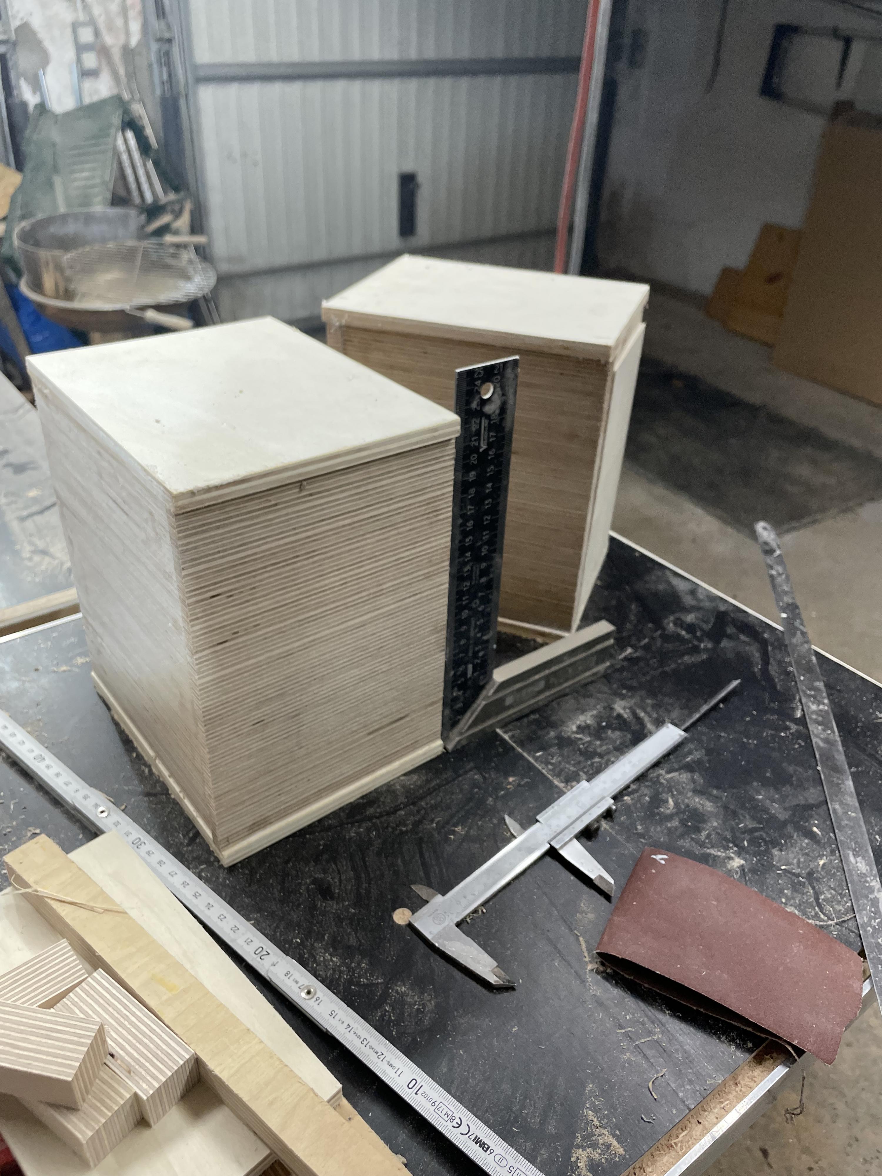 vielleicht nochmal, zur Erinnerung, diese Box hier rechts am Bildrand ist mit Reststücken MPX gebaut, die so noch rumlagen, die Größen der Abschnitte waren im Bereich bis maximal 40 cm länge und teilweise nicht breiter als 4-6 cm. Alle in der Werkstatt herumliegenden Stücke wurden genutzt. Und wie ich finde hat das richtig gut geklappt, (ganz am Rande habe ich die Werkstatt dabei sehr sauber bekommen) ... die MPX-Stärken sind dabei egal, hier in dem Fall waren es 15, 18 und 24er Material. Wichtig ist ja nur dass die Schnittbreite bei allen Materialien gleich ist, und das war dieses mal 21 mm, was am Ende, nach dem Grobschliff, ziemlich genau 20 mm ergab.