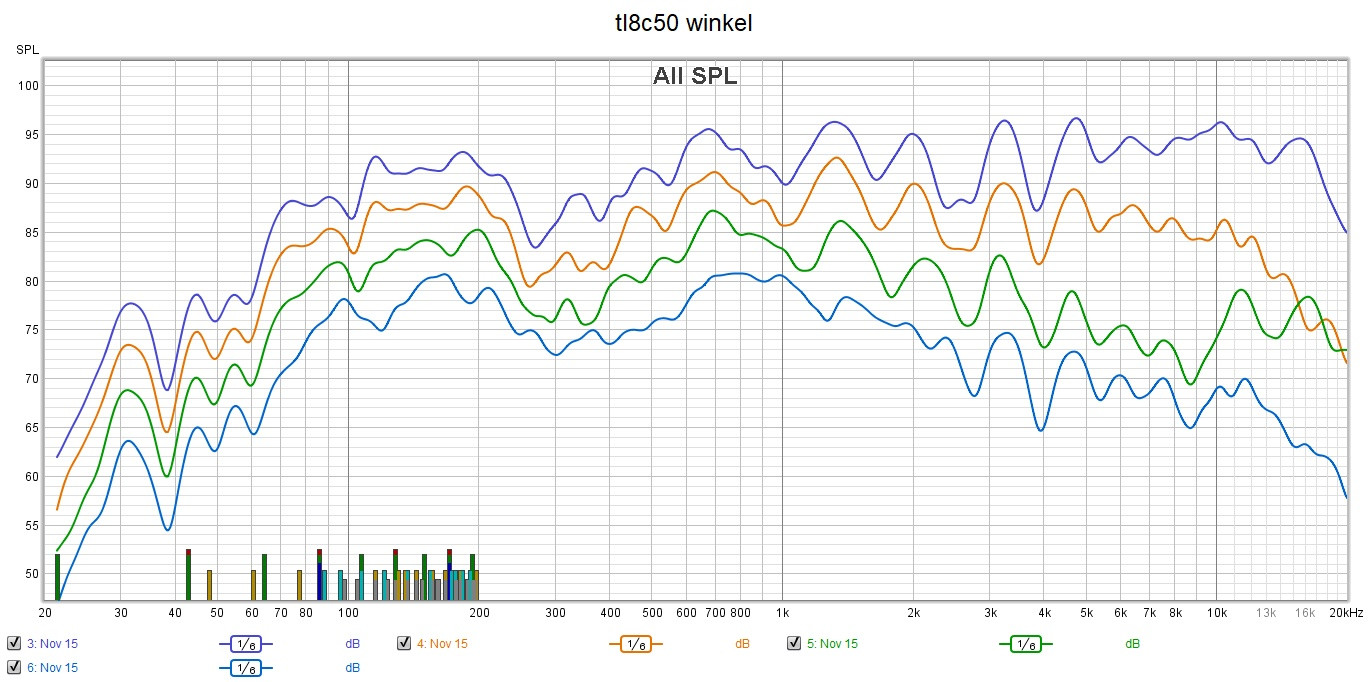 Der TL8C50 ist ein Außnahmeschallwandler, der bis auf eine kleine Störung bei 3 kHz auch Fullrangetauglich ist. Der Einbruch im Grundton kommt von der Position des Mics, quasi aus der Messposition zur Box, und sollte sich größtenteils unter größeren Entfernungen ausgleichen. (da mache ich mir überhaupt keine Sorgen, denn ich kenne den Corel in der Distanzmessung und da ist die Grundtonschwäche nicht,...) Aber man sieht eindeutig die Bündelung zum Hochton hin, und alleine deshalb ist der Hochtöner sinnvoll, ... der in seiner Dimension natürlich auch im SHT bündelt, ähnlich der neuen G25NDWG im Waveguide, dies ist ziemlich vergleichbar.