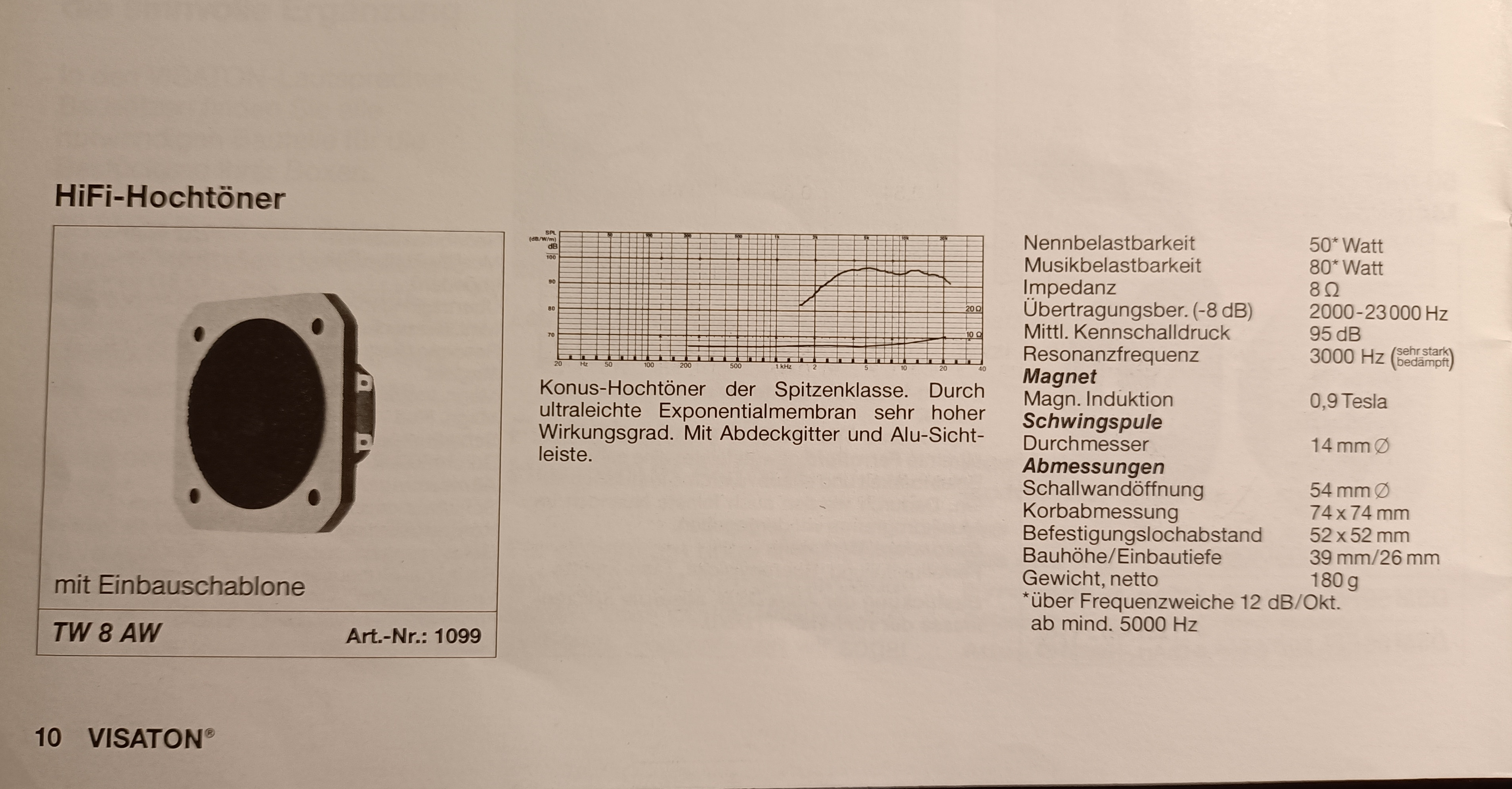 ID: 724802 aus dem Visaton Programm von 1989, im 1986er Katalog war der TW8AW auch noch in 4 Ohm gelistet.