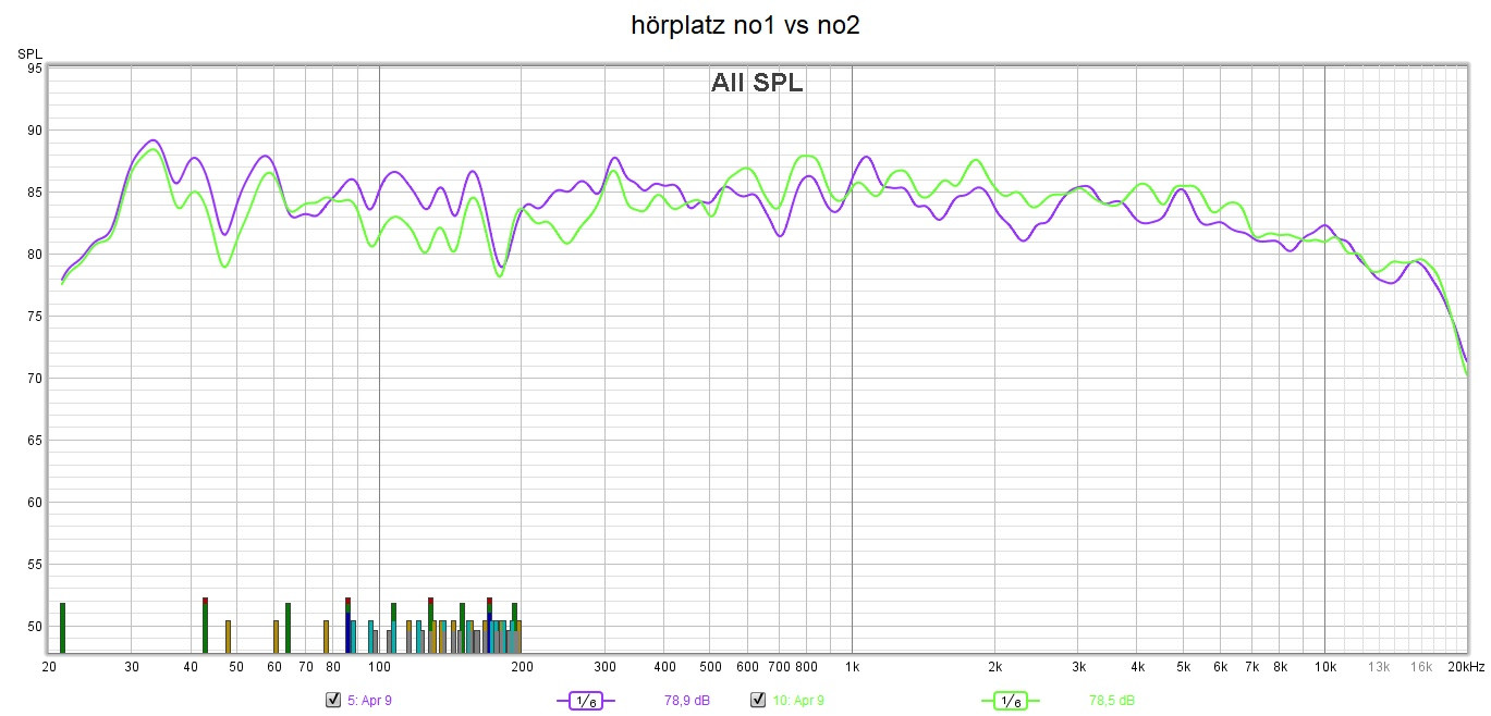 Eine eindeutige Klangunterscheidung kann ich nicht wirklich machen, aber ich hänge die beiden Hörplatzmessungen an, dass man sich ein Bild davon machen kann:
