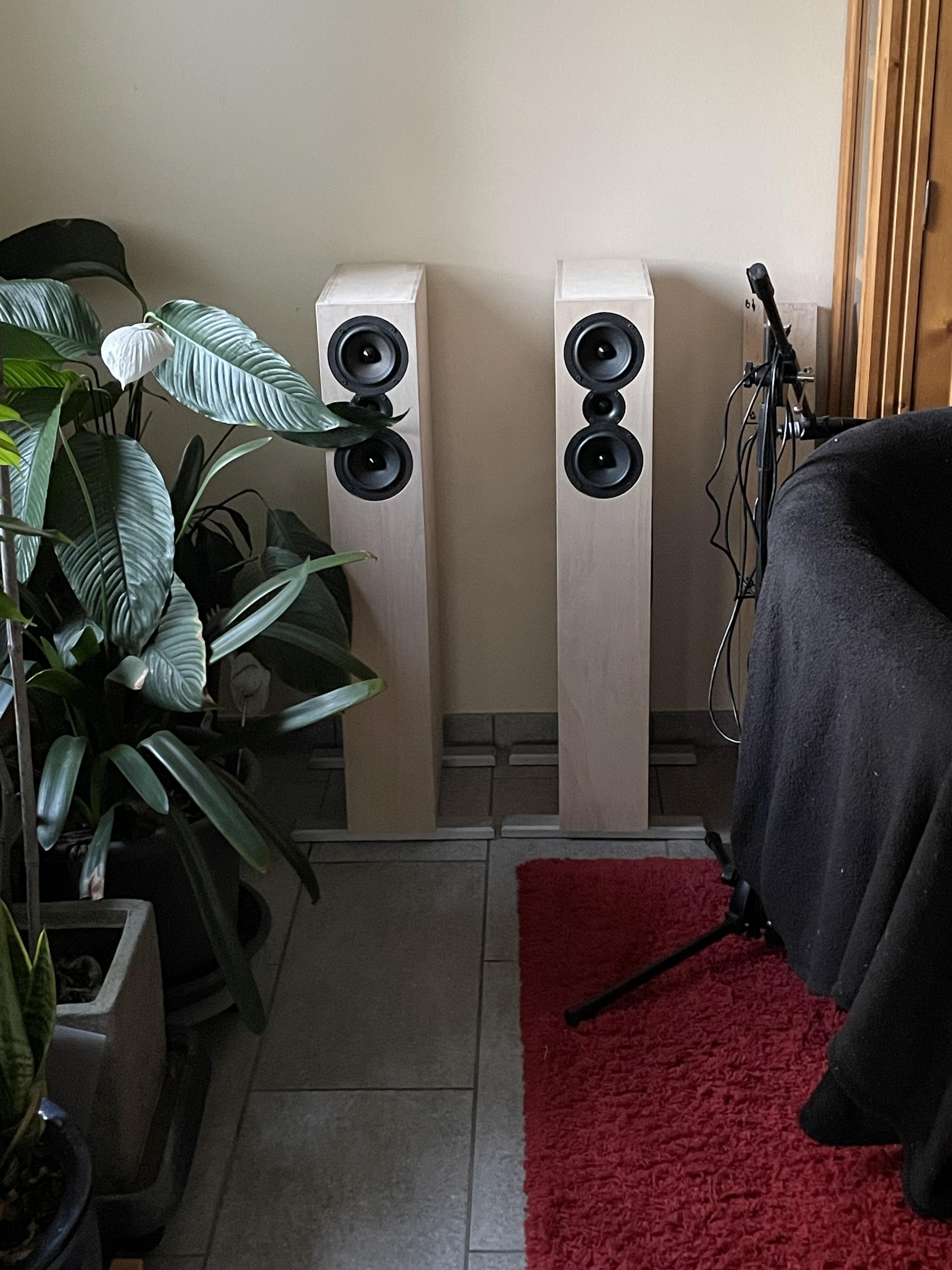 nach zwei Tagen "Reinhören" gibt es keine negativen Überraschungen, und die Bewertung des Klanges am Hörplatz ist ganz ähnlich was Frank vor kurzem gepostet hat. Der B100 ist im Vergleich zum TI100 etwas weicher, und bleibt dabei sehr detailreich. Dies kann durchaus mehr gefallen, als die Wiedergabe mit dem TI100 im Mittelton. Der massive BR-Kanal in der No.1 und das Standardrohr von Visaton bei der No.2 machen sehr ähnliche, aber hohe, Abstimmungen um die 40 Hz. Mein GF250 Doppelsub war gleich abgestimmt und somit für mein Wohnraum genau richtig, um 30 Hz im Raum zu erreichen. Beide Bässe, der TIW250XS und der GF250 machen beide einen hervorragenden Job im kleinen BR-Gehäuse, ... Ich habe gestern Abend eine Weile sehr laut an der No.2 gehört. Der Bass bleibt sehr lange unbeindruckt, wobei irgendwann die B100 in ein unangenehmes Nebengeräusch abgleiten, ... und zwar wird der Klangeindruck im Mittelton aggressiver/rauher, die Gf250 machen dabei geschätze 5 mm Hub, wobei die B100 sehr wenig Hub machen müssen, und trotzdem merkt man am Klang deren Ende. Und im Maxpegelvergleich macht der HT seine Arbeit ganz hervorragend, dem traue ich noch eine lautere Kombination zu. Hier in dem Fall bewegen wir uns bei knappen 110 dB in einem Meter Entfernung, beim Abspielen von Musik. (ich nehme da immer: https://www.google.com/url?sa=t&sour...Spjrykzkew47Ub )