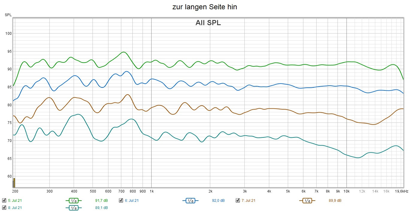 inzwischen habe ich auch jede Menge Messungen an verschiedenen Punkten im Raum durchgeführt, je weiter, dass man von der Boxenebene weg ist, desto mehr ist die Anordnung der Boxen egal, ... das passiert schon ab drei Meter Abstand, ...