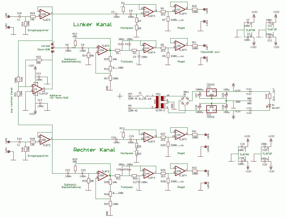 Was ich noch (Artikel hier vor mir) habe ist eine einfache LR12 Weiche mit Bassentzerrung und Delay für einen Zweiweger (du hast doch zwei von den 21-Zöllern, also 2.2