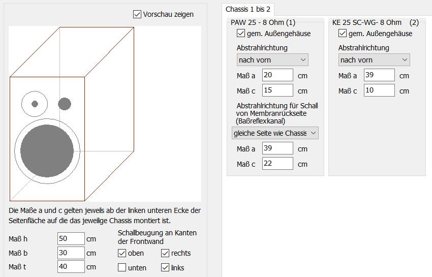 die Seitenwände sind 15ner MPX (gefalzt, an den Ecken) und die Schallwand (aufgesetzt) und die Rückwand (eingesetzt) sind 24 mm MPX. Hat keinen speziellen Grund, nur den, dass ich das Material in Reststücken da hatte. Ich wollte die Schallwand etwas dicker haben, aber die Rückwand hätte man auch dünner machen können.