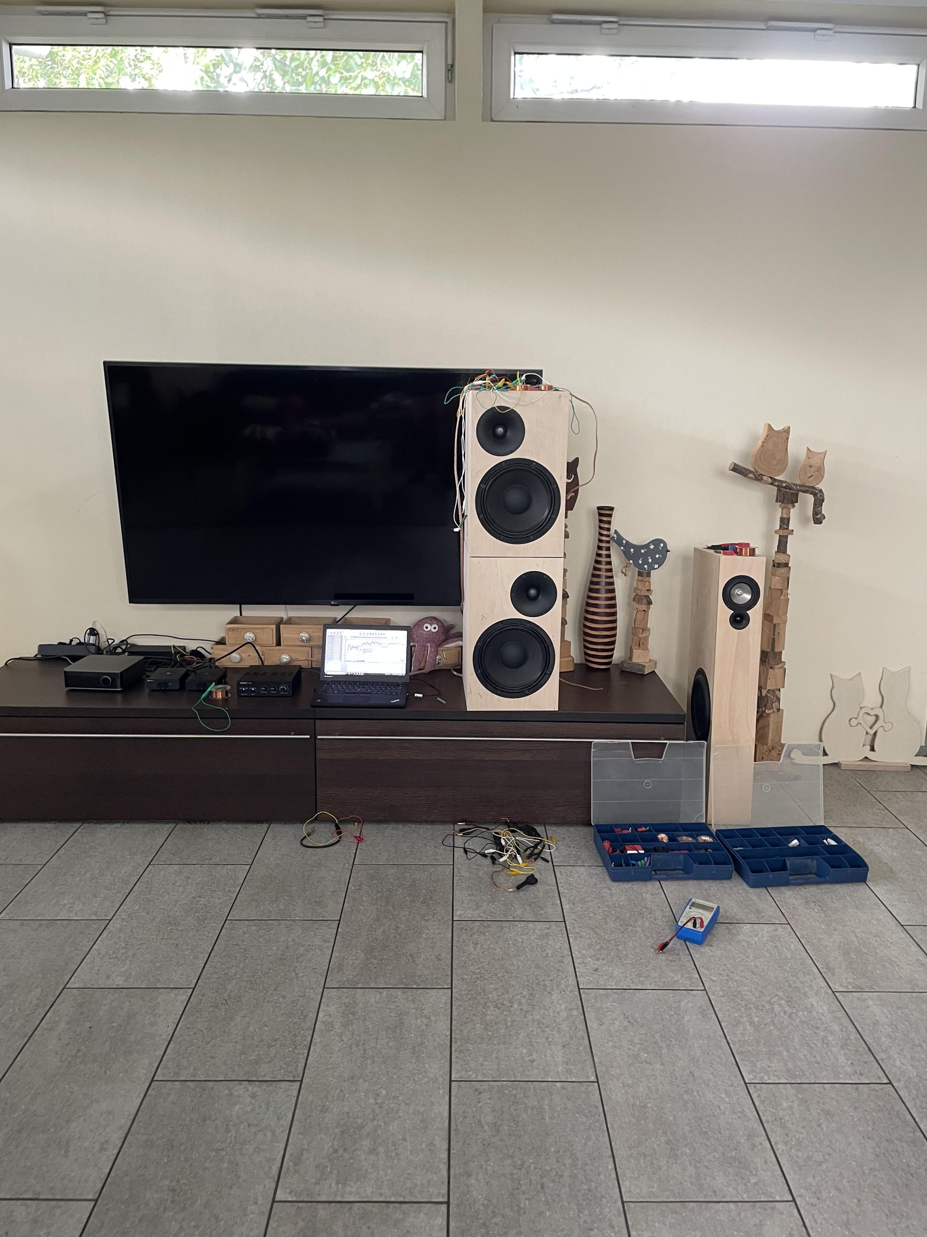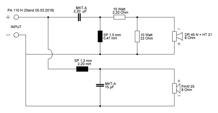 Den Hochtöner habe ich verkabelt und das Kabel durch das BR-Rohr nach außen geführt. Den Bass habe ich so angeschlossen, dass über die Messingbuchsen das Signal vom Bass abzugreifen ist, quasi ohne Weiche direkt an den Eingang angeschlossen.