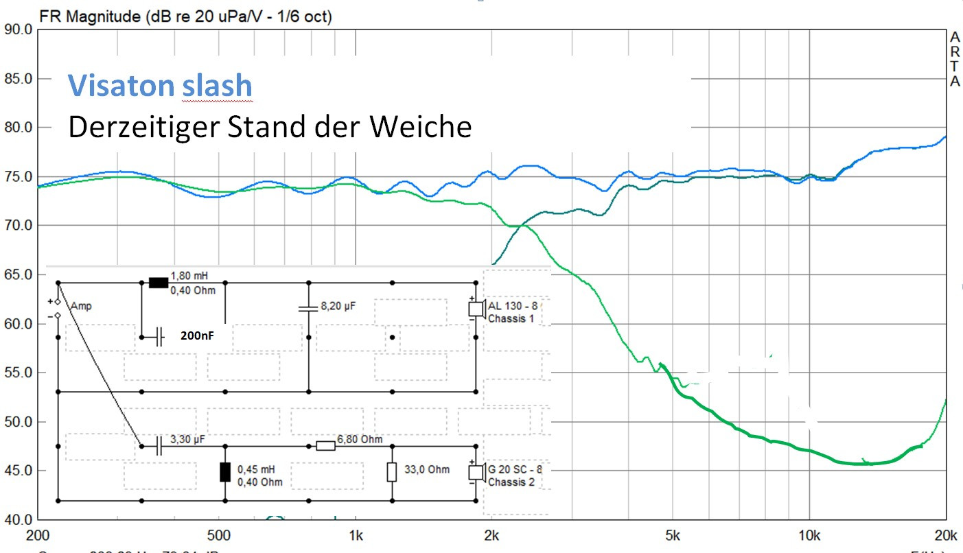 Ich habe natürlich nur eine Box, höre mit der provisorischen Weiche also mono im Vergleich zur Tafal. Fazit: Hört sich noch sehr grell an gegen die Tafal. Habe durch Vergrößerung des Parallelwiderstandes ohne zu messen nach Gehör den Hochton mal leiser gemacht. Drastisch zum Schluss. Parallelwiderstand nur noch 8,2 Ohm. Dadurch stimmen aber irgendwie die Mitten nicht mehr. Da muss ich also noch mal dran.