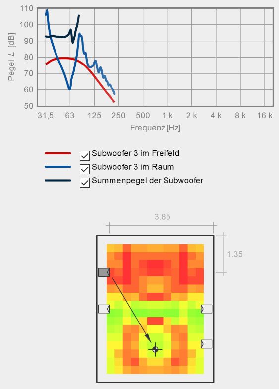 Wenn ich mehrere Subwoofer verteilen würde, könnte ich die seitlich längs bei 1/2 (gegen die erste Längsmode) und bei 1/4 bzw. 3/4 (gegen die zweite Längsmoden) verteilen.