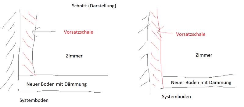 Mit was sollte ich am besten anfangen? Boden, Wand, Decke? Wenn ich mit dem Boden anfange, deckt die Vorsatzschale den Teil vom Boden nicht ab. Oder ist der Aufbau egal, da man sowieso alles entkoppelt und mit Dämmstreifen versieht? Oder wäre es doch besser zuerst den Boden zu entfernen, die Vorsatzschale für die Wand zu errichten und dann mit dem Boden zu beginnen? Ich habe ein Bild zum besseren Verständnis angehängt.