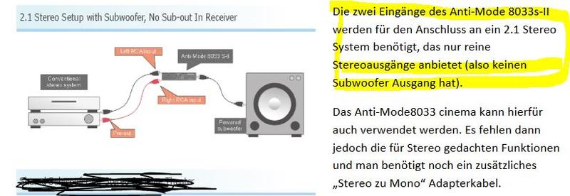 DSPeaker Anti-Mode 8033 cinema / 8033s-II - Automatische Basskorrektur Seite 6 von 24 Die doppelten Eingänge des AM 8033s-II (LEFT / RIGHT LINE IN) können für Stereo-Vorverstärker benutzt werden, die keinen separaten Subwoofer Ausgang anbieten. Sie können diesen Anschluss auch dazu benutzen, um Ihre Heimkino-Anlage per LFE-Ausgang am LINKEN Eingang und Ihr Stereosystem am RECHTEN Eingang zu betreiben. Bitte benutzen Sie dazu unseren „Stereo zu Mono“ Adapter (optional). Beide Anti-Mode 8033 Modelle können auch für eine Verbindung zu Lautsprecher-Output-Pegel eingesetzt werden. Dafür verwenden Sie bitte einen High/Low Adapter zur Pegelreduzierung oder auch ein passendes Kabel mit einem Widerstandsnetzwerk. Bei Fragen dazu sprechen Sie uns bitte an, wir helfen gerne weiter.